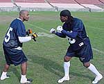 Along with George Jones, the Xtreme offense also got deeper with the recent signing of free agent wide receiver Damon Dunn (that's him on the left, sparring with fellow WR, Jermaine Copeland). A former Stanford stand out, Dunn brings three years of NFL experience tempered with a veterans attitude about his roll in the XFL.