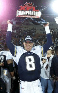 LOS ANGELES (April 22, 2001 12:53 a.m. EDT http://www.sportserver.com) - Tommy Maddox, out of football and running an insurance agency two years ago, beamed and held the XFL championship trophy high over his head as he trotted first to the stands on one side, then across the field to the other.